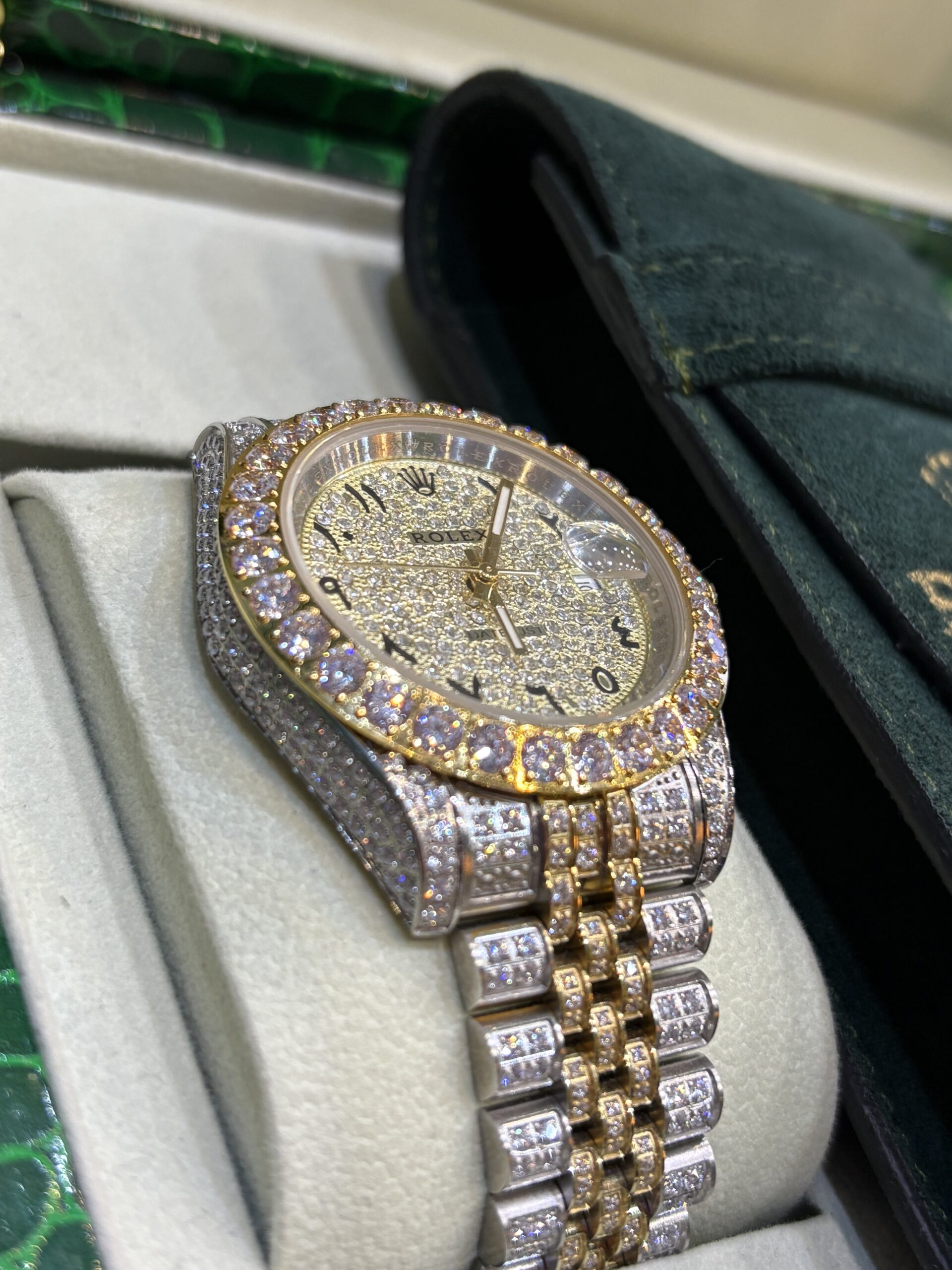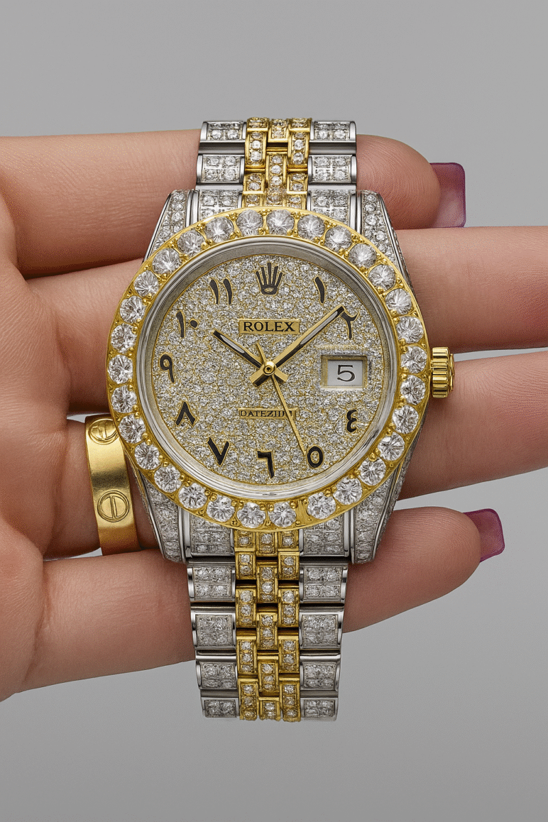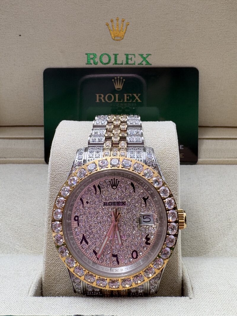 • این ساعت یک نسخه‌ی تمام کارخانه‌ای رولکس (Factory Set) نیست، بلکه احتمالاً به‌صورت Aftermarket Custom (سفارشی‌سازی شده پس از خرید) با الماس و صفحه عربی ساخته شده است.