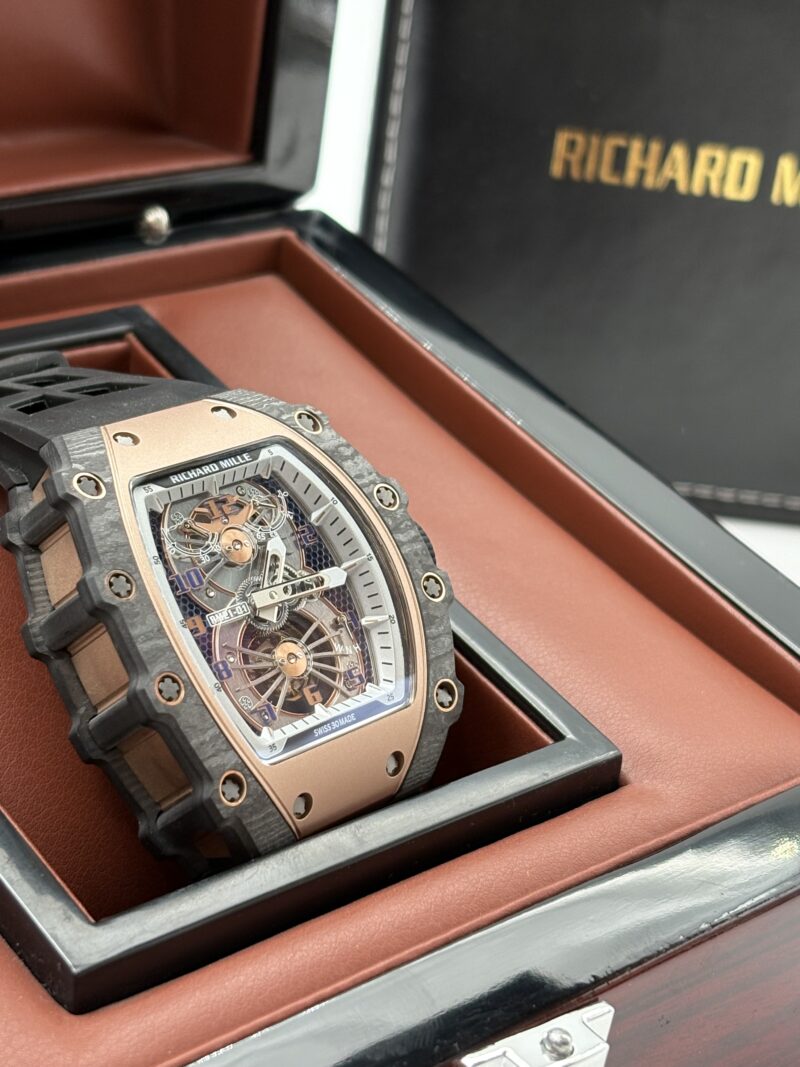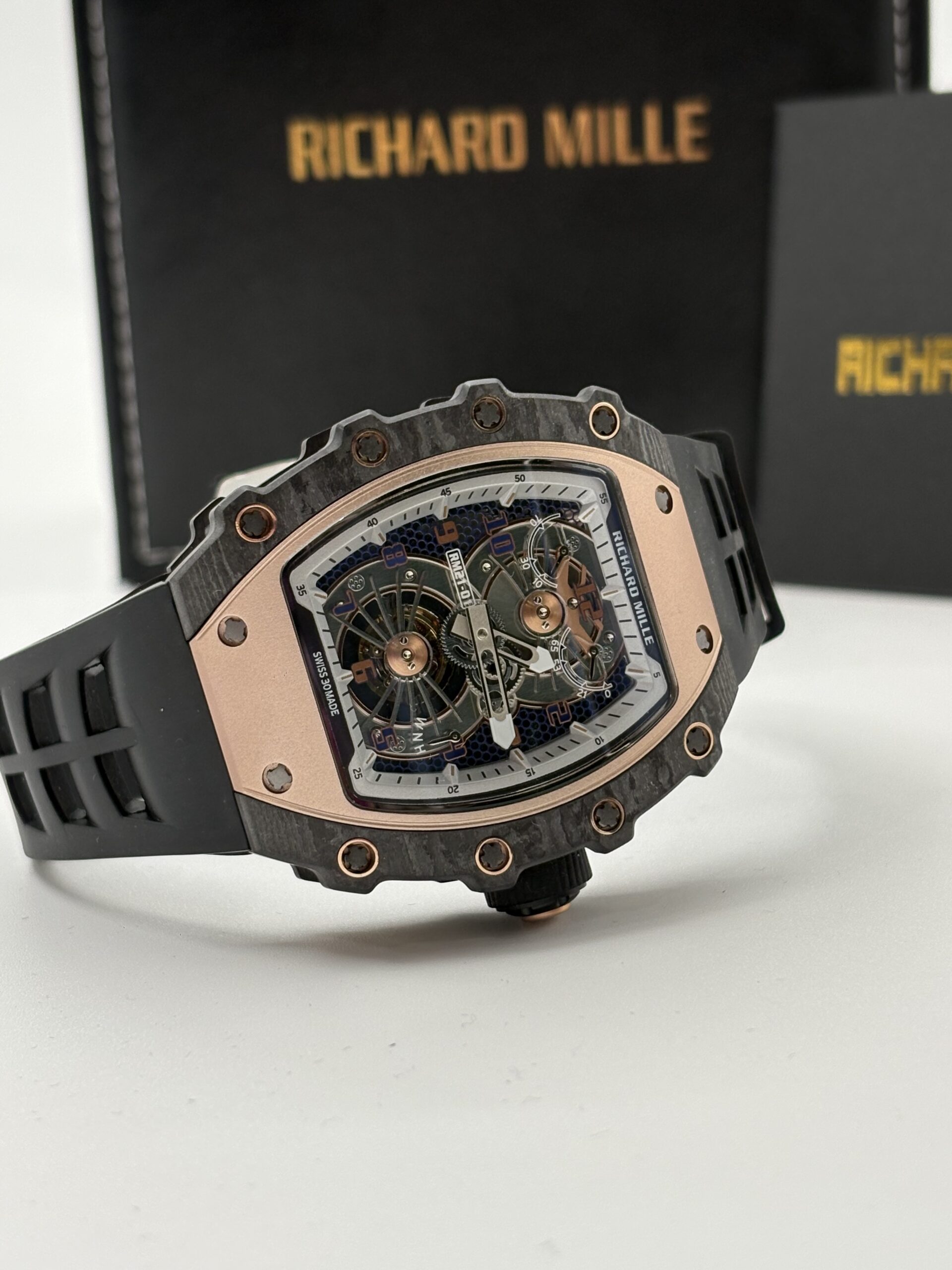 • قاب (Case): ترکیب کربن TPT مشکی با روکش رزگلد (Rose Gold) – طراحی دو متریاله خاص Richard Mille